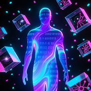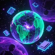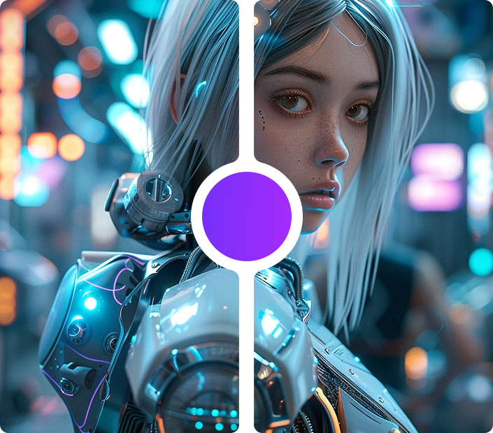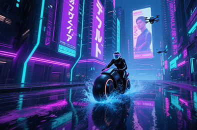 Combining future technology with urban landscapes, typically featuring strong contrasting colors and neon effects, suitable for science fiction themes.